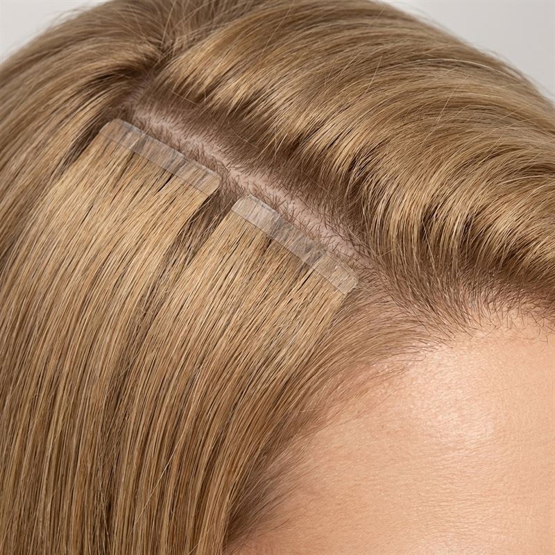 Få lækkert fyldigt hår med tape extensions af ægte remy hår. Vores tape extensions består af ægte hår, som er fæstnet til en gennemsigtig silikonetrense, som ser ud som din hovedbund.  Dette giver en usynlig overgang mellem dit eget hår og dine extensions. På silikonetrensen sidder et stykke skånsomt tape som nemt fæstnes til dit eget hår.