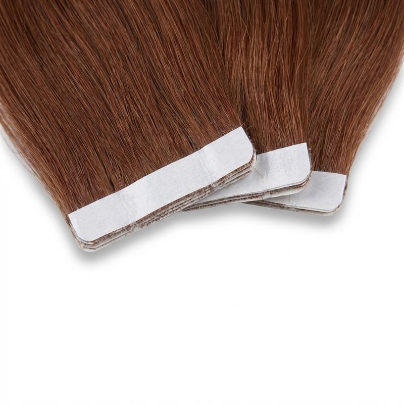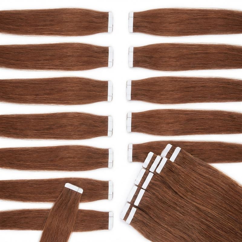 Få lækkert fyldigt hår med tape extensions af ægte remy hår. Vores tape extensions består af ægte hår, som er fæstnet til en gennemsigtig silikonetrense, som ser ud som din hovedbund.  Dette giver en usynlig overgang mellem dit eget hår og dine extensions. På silikonetrensen sidder et stykke skånsomt tape som nemt fæstnes til dit eget hår.