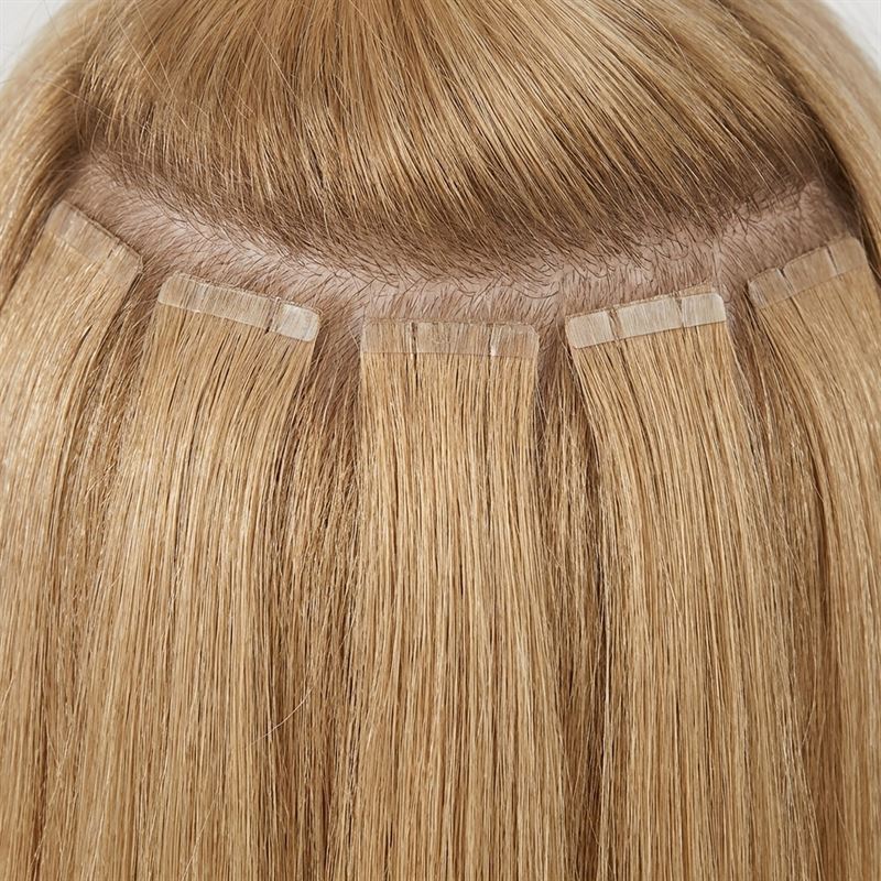 Få lækkert fyldigt hår med tape extensions af ægte remy hår. Vores tape extensions består af ægte hår, som er fæstnet til en gennemsigtig silikonetrense, som ser ud som din hovedbund.  Dette giver en usynlig overgang mellem dit eget hår og dine extensions. På silikonetrensen sidder et stykke skånsomt tape som nemt fæstnes til dit eget hår.