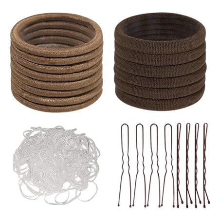 De brune elastikker er skånsomme mod håret og giver et sikkert hold uden at slide, knække eller efterlade mærker. De gennemsigtige mini-elastikker er ideelle til fletninger, små totter og præcise opsætninger, hvor elastikken skal være usynlig. Hårnålene har afrundede ender og glat overflade, så de ikke kradser i hovedbunden og samtidig holder håret sikkert på plads.