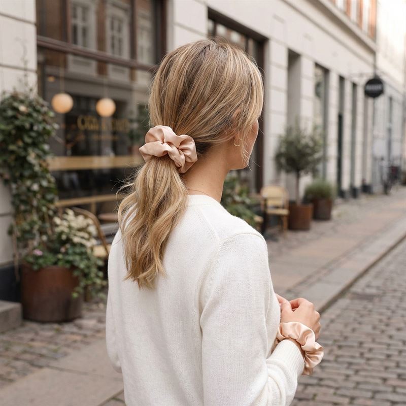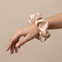 Dristig og elegant scrunchie af satin til at lave en hesthale, knold eller lignede. Kan også bæres som et armbånd.