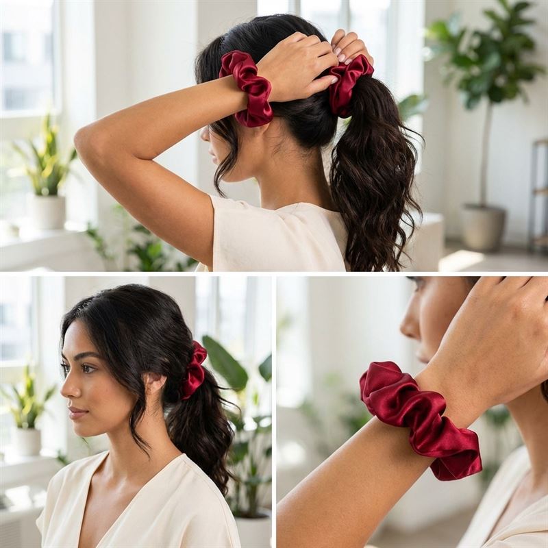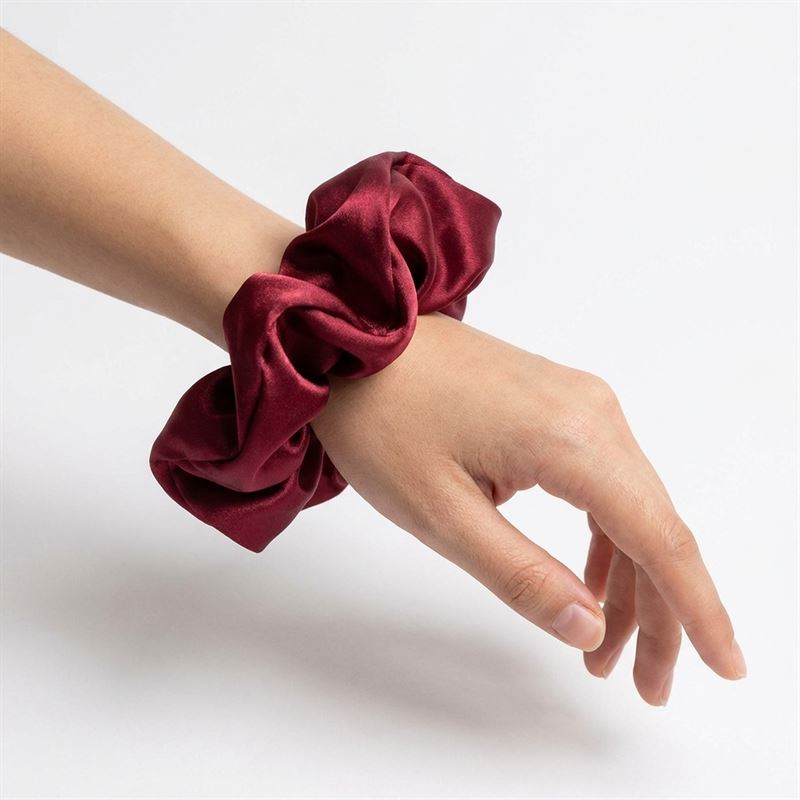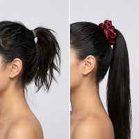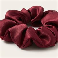 Dristig og elegant scrunchie af satin til at lave en hesthale, knold eller lignede. Kan også bæres som et armbånd.