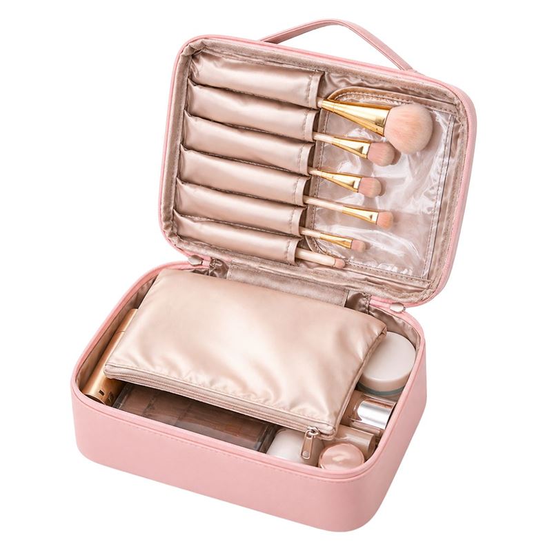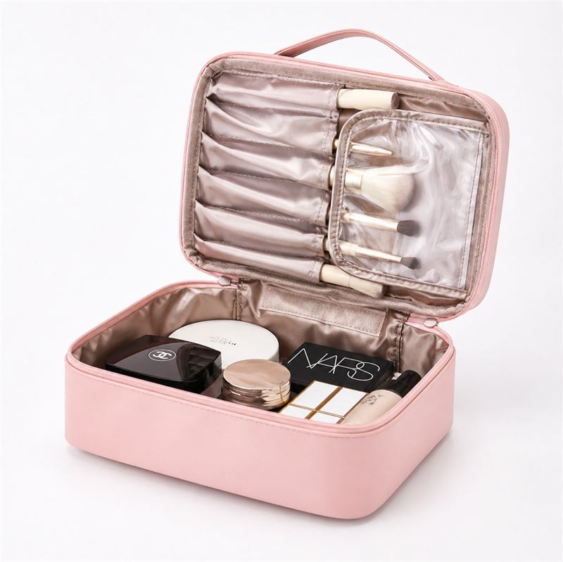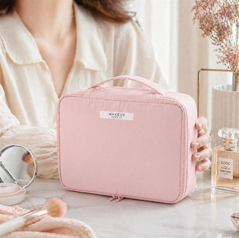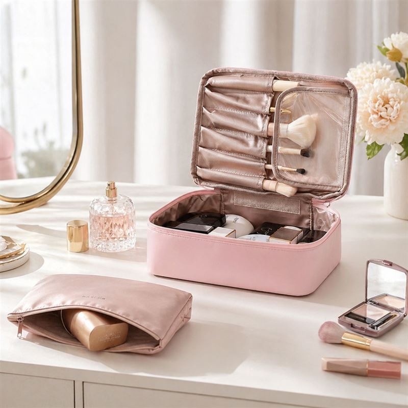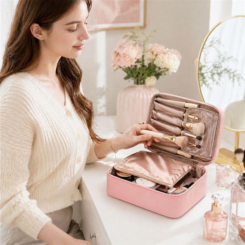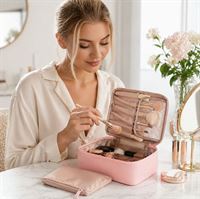 Den lyserøde farve giver tasken et blødt, moderne og eksklusivt udtryk, som passer perfekt til dig, der gerne vil kombinere funktionalitet med et feminint look. Brug den til makeup, hudpleje, pensler, små accessories og andre essentials, når du vil have en pæn og overskuelig organizer med god plads og smart inddeling.
