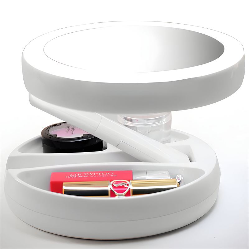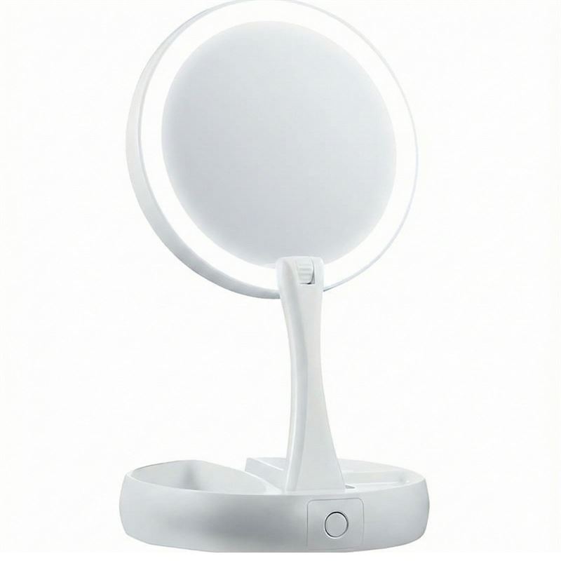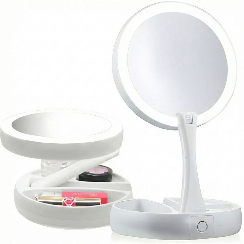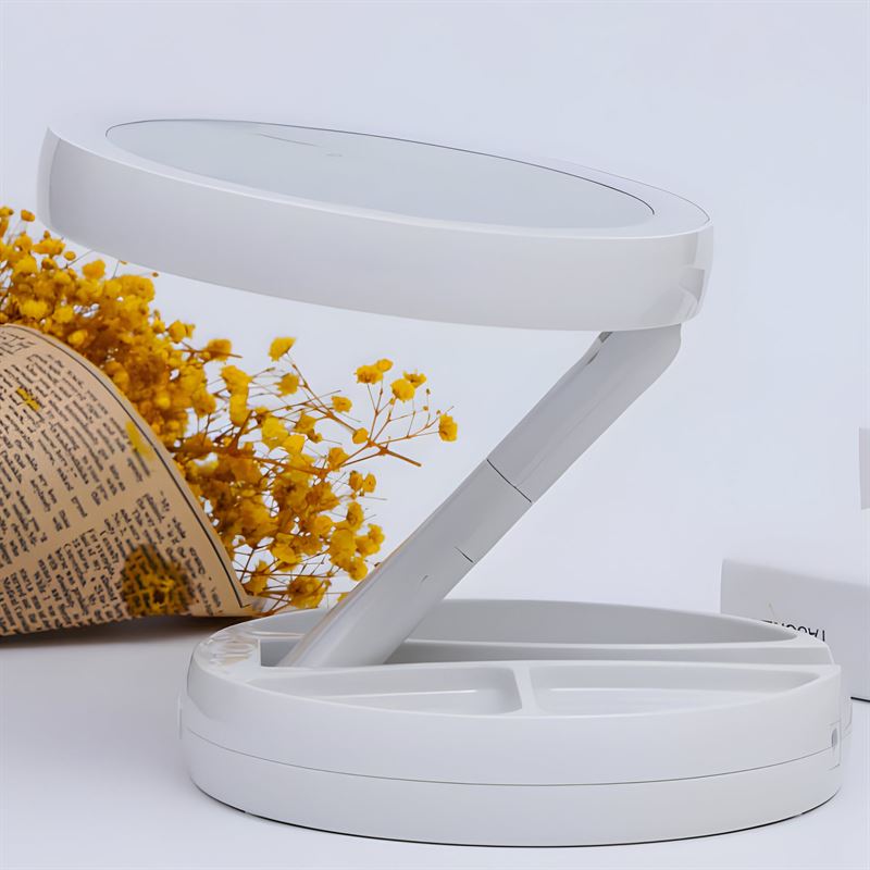 UNIQ Foldbart Makeup Spejl med LED-lys – Dobbeltsidet 1x/10x forstørrelse + 3 opbevaringsrum (Hvid)