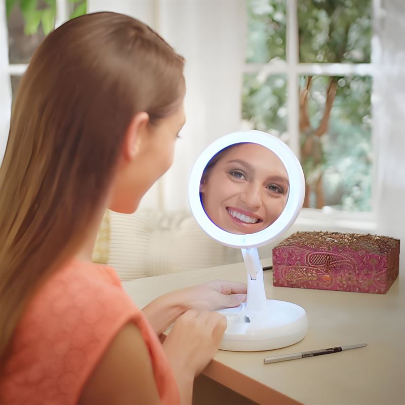 • Dobbeltsidet spejl: 1x til overblik + 10x til detaljer (fx bryn, eyeliner og små områder).
