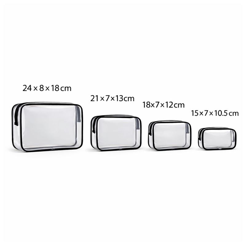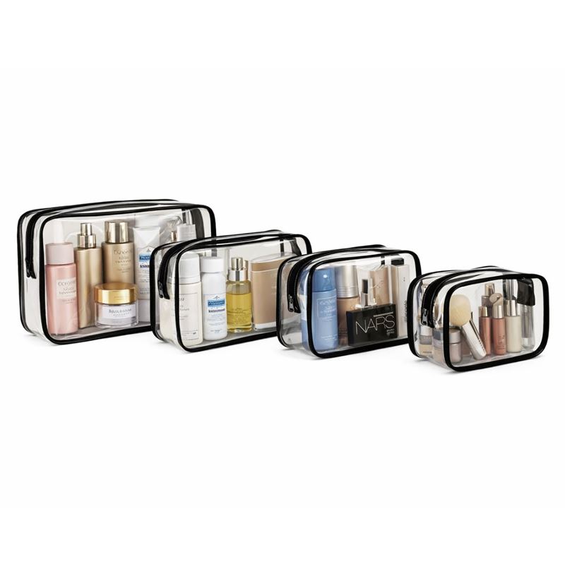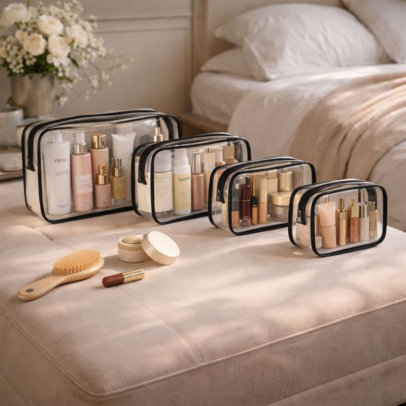 De fire størrelser gør det let at opdele dine produkter efter behov. Brug den største taske til større flasker og hudpleje, de mellemstore til makeup og daglige favoritter, og den mindste til småting som læbepomade, mini-produkter eller accessories. Det giver en mere ryddelig pakning og hjælper dig med at holde dine produkter samlet og beskyttet, uanset om du skal på ferie, weekendtur eller bare vil skabe mere orden i hverdagen.