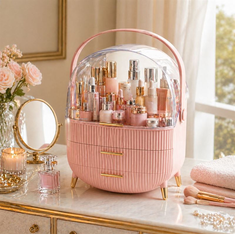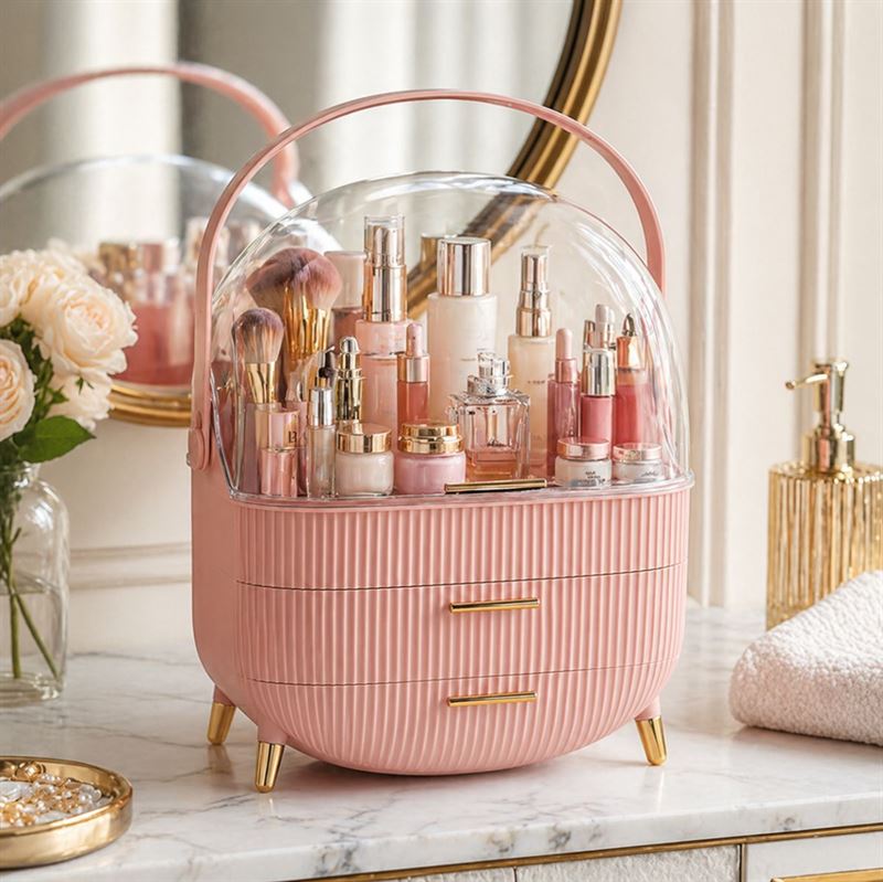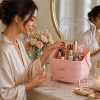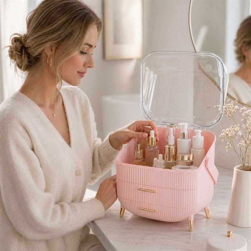Lav plads til elegance og funktionalitet med denne UNIQ Retro Makeup Box Organizer i Rosa. Bestil nu og oplev en verden af organiseret luksus!